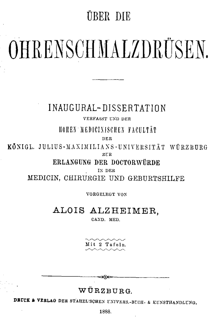- Alzheimer A (1888) Ueber die Ohrenschmalzdruesen [On the earwax glands]. Inaugural-Dissertation [Medical doctoral thesis], Koenigliche Julius-Maximilians-Universitaet Wuerzburg; 20 pages and 2 plates with illustrations