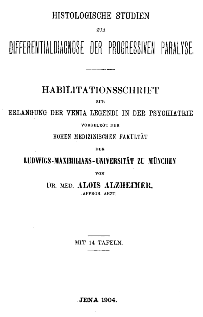 - Alzheimer A (1904) Histologische Studien zur Differentialdiagnose der progressiven Paralyse [Histological studies on the differential diagnosis of progressive paralysis]. Ludwig-Maximilians-Universitaet Muenchen [Habilitation thesis]