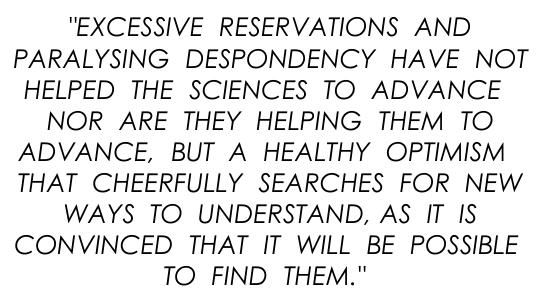 “Excessive reservations and paralysing despondency have not helped the sciences to advance nor are they helping them to advance, but a healthy optimism that cheerfully searches for new ways to understand, as it is convinced that it will be possible to find them.”